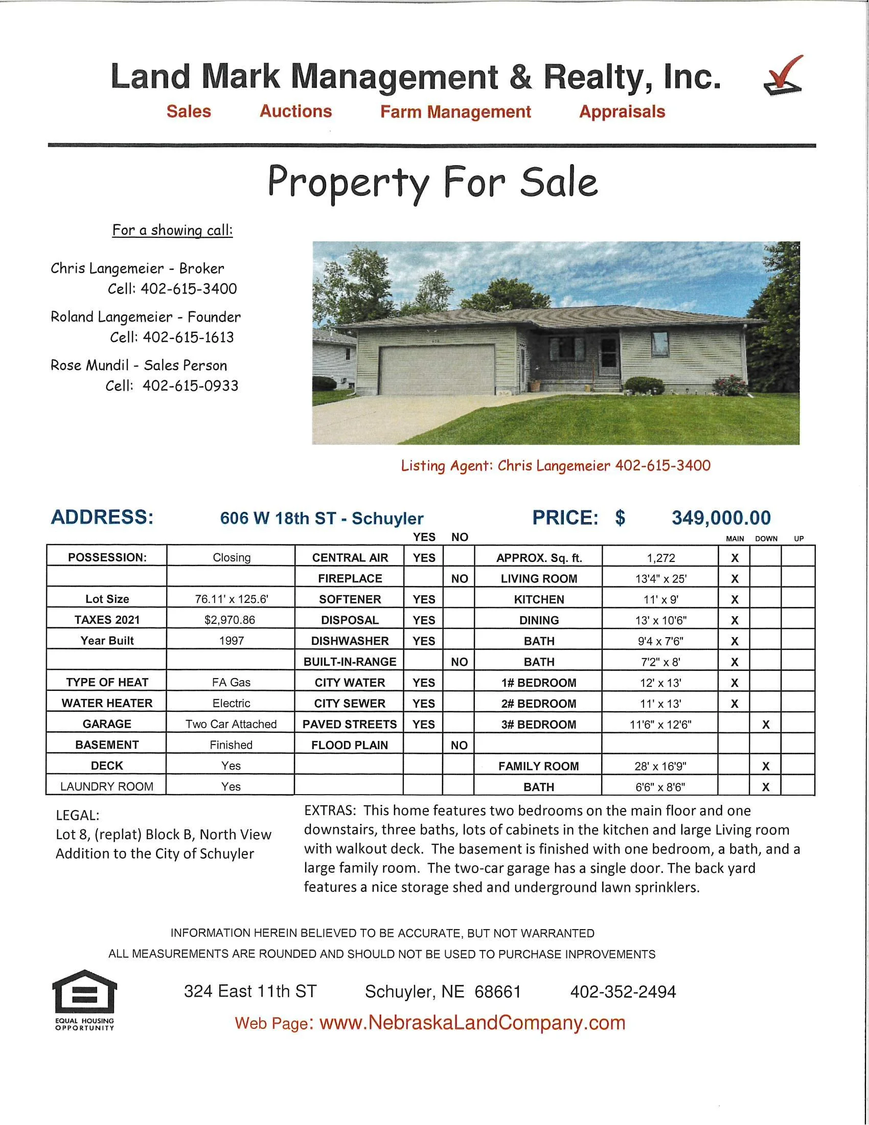 This home features two bedrooms on the main floor and one downstairs, three baths, lots of cabinets in the kitchen and large Living room with walkout deck. The basement is finished with one bedroom, a bath, and a large family room. The two-car garage has a single door. The back yard features a nice storage shed and underground lawn sprinklers. Call listing agent Chris Langemeier at 402-352-2494 today.