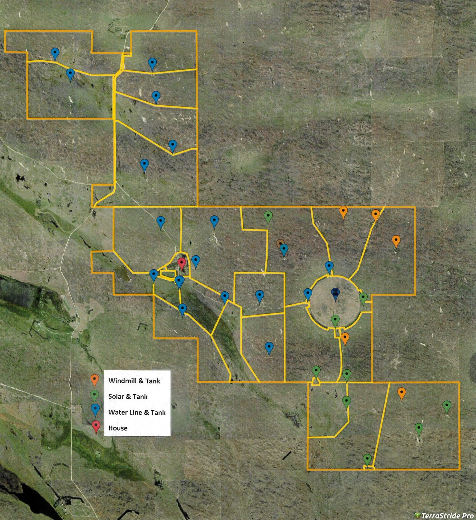 The ranch is cross fenced into twenty-two pastures designed for efficiency in a rotation grazing plan. Each pasture has ample water with underground water systems to enhance the windmill or solar well at each tank. Owner rated carrying capacity is 475 pairs. Added enhancements is 180± acres of crop ground under pivot. The crop ground is currently divided into three paddocks for rotational grazing under the pivot. The irrigation well is set at 1,260 gpm with the ability to use chemigation.
