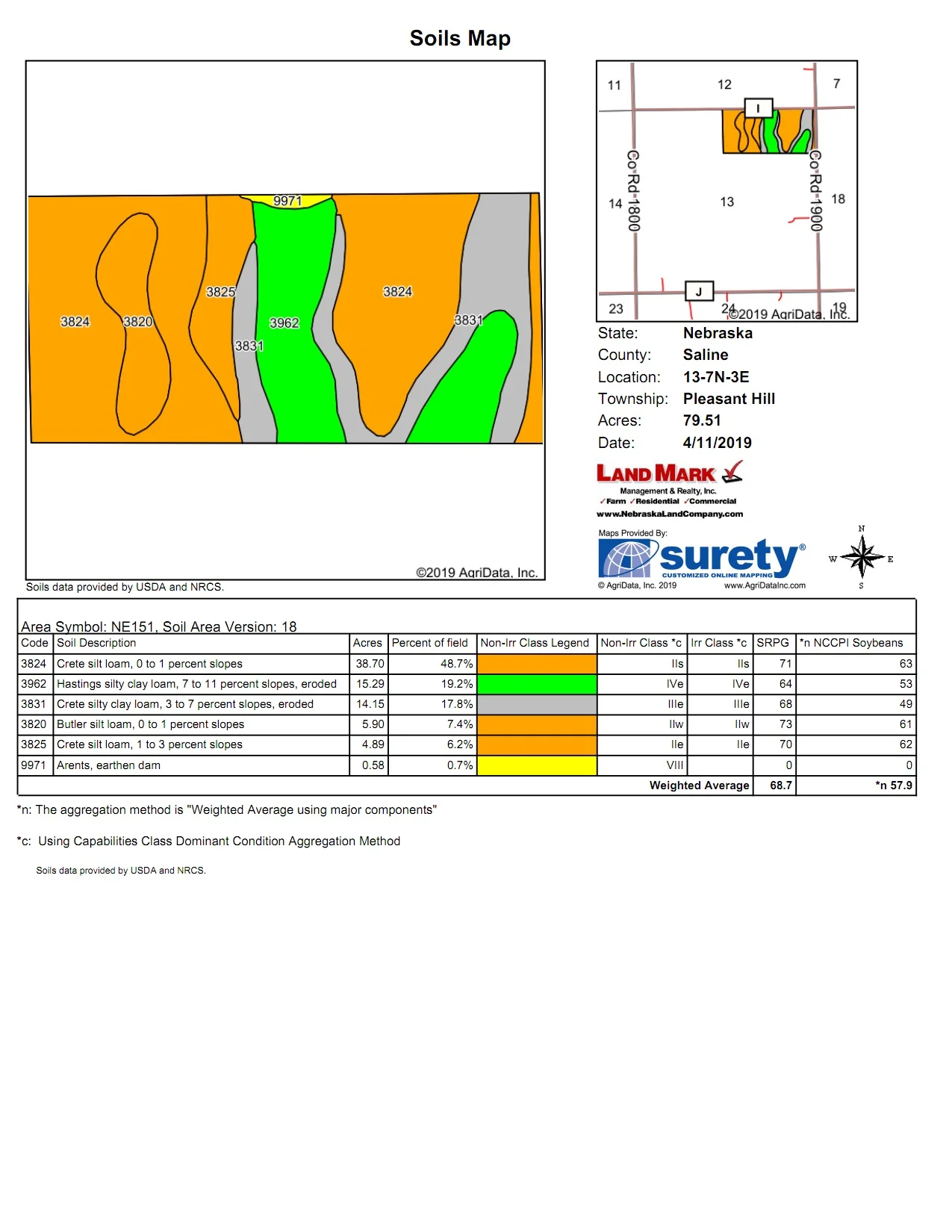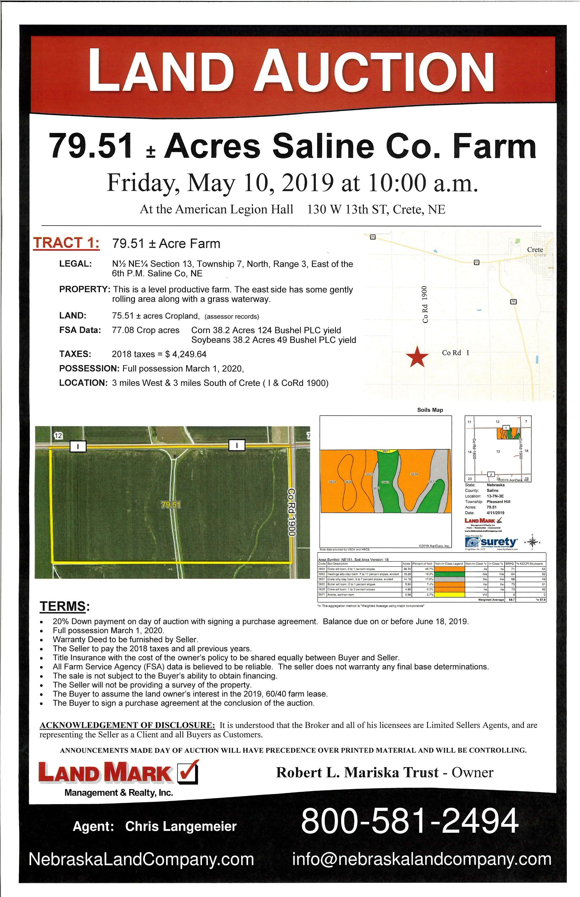 Offered at public auction is 79.51 ± acres of Saline county farmland. This property is located south west of Crete Nebraska. Is over 50% class one soils and 78% class one’s and two soils. This productive farm has good access on two sides with good farm ability.